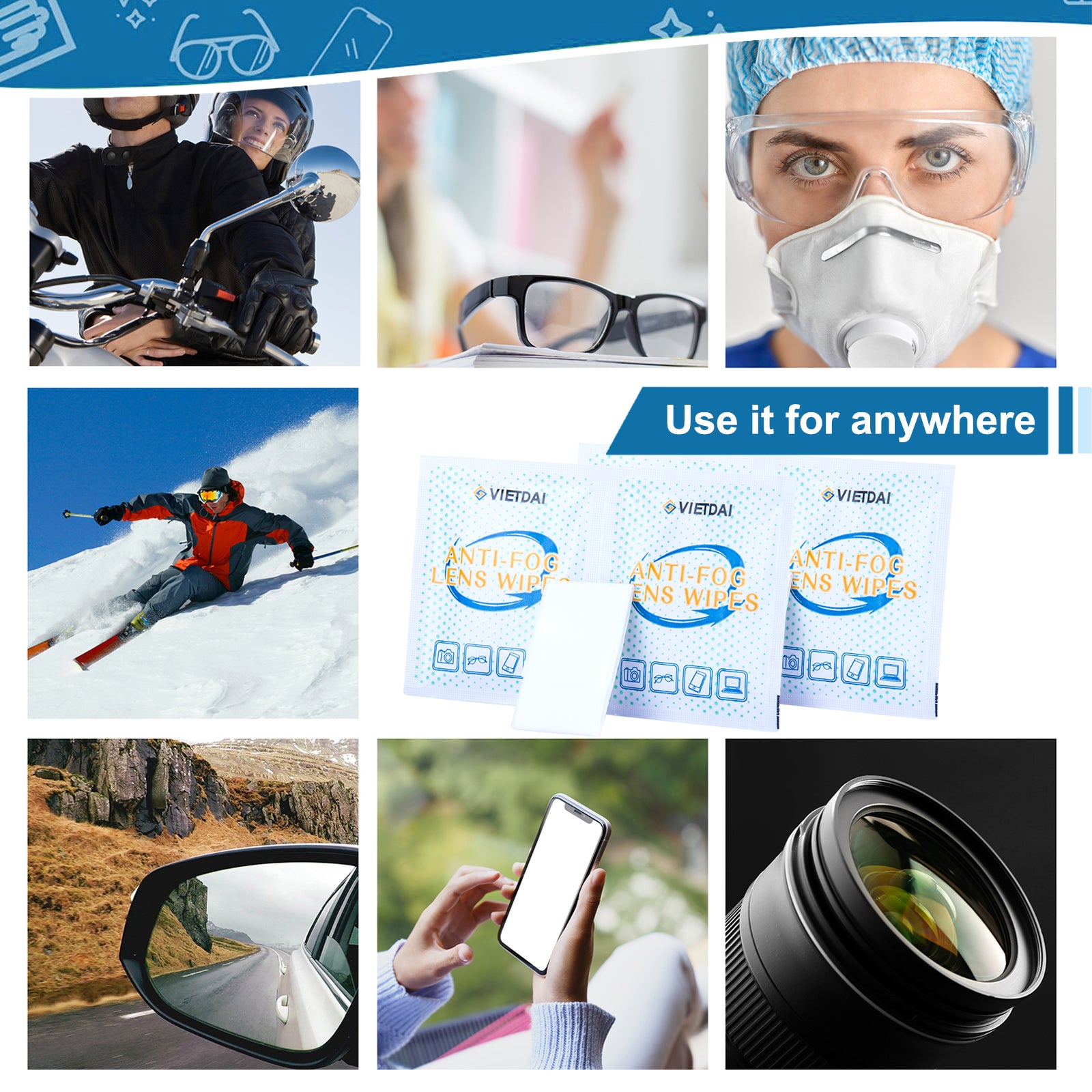 VIETDAI Lens Anti-Fog Wipes safely and quickly clean eyeglasses and sunglasses as well as other optical components such as camera lenses, webcams, binoculars and microscopes. These wipes are specially formulated with a unique mild solution to gently and effectively remove smudges and dirt, leaving optical surfaces free of scratches, streaks or residue. Individually wrapped for easy storage in your purse, backpack, desk or car.